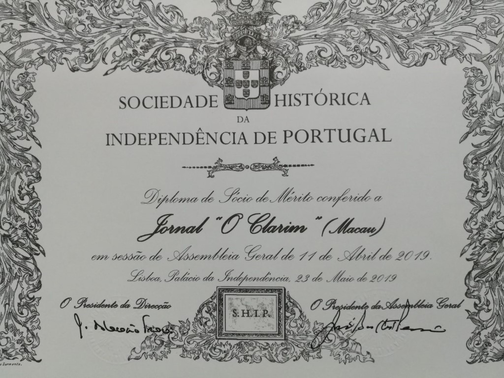 On 23 May, Thursday, at 6:00 PM, the Historical Society of the Independence of Portugal (SHIP) handed a diploma to O Clarim for its “unequivocal and praiseworthy work … in the dissemination of the Portuguese Language and Culture in Macau” and enrolled the diocesan weekly as an Honorary Member of SHIP.