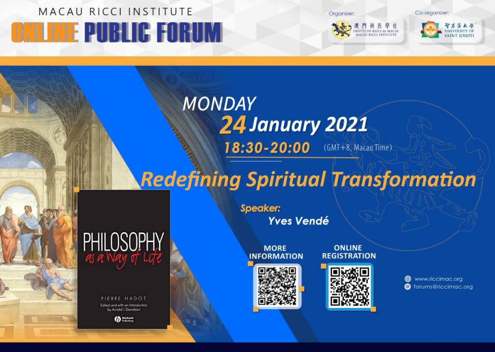 O Instituto Ricci de Macau (IRM) promove ao final da tarde de 24 de Janeiro uma palestra “online” focada no desígnio da transformação espiritual. A iniciativa tem como orador o jesuíta francês Yves Vendé, professor de filosofia na Universidade Católica de Lille. Vendé, um especialista na obra do filósofo francês Pierre Hadot, propõe-se abordar não apenas o contributo da filosofia como ponto de partida para a transformação espiritual, mas sugere também um exercício comparativo entre a Filosofia Grega Clássica e a abordagem ao Confucionismo, tal como foi concebida por Zhu Xi há um milénio.