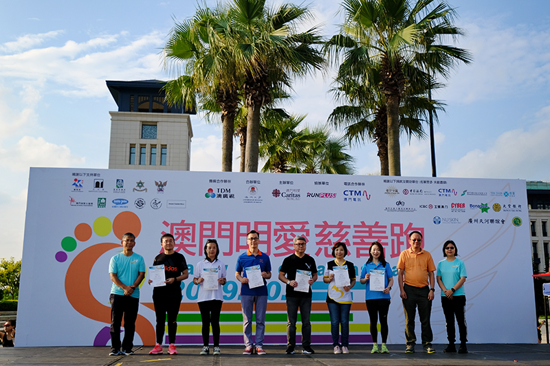 慈善跑啟跑禮由體育局潘永權局長、社會工作局家庭及社區服務廳鄧玉華廳長、澳門大學體育事務周桂慈總監、澳門廣播電視股份有限公司董事暨執委會羅崇雯委員、金沙中國有限公司社會事務林妤庭總監、中國銀行澳門分行義工協會梁世權副會長、澳門電訊有限公司企業傳訊陳靜儀總監、澳門明愛潘志明總幹事及袁志海服務總監一同主持了啟跑儀式。