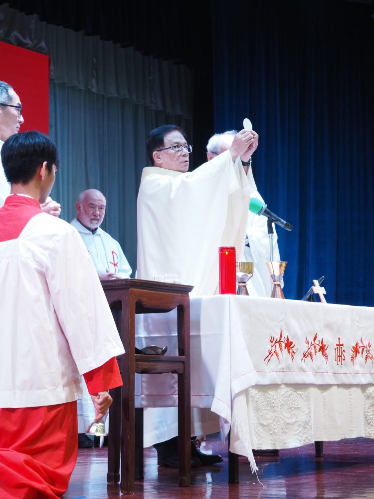 隨後,繼續舉行「70周年校慶啟動禮感恩彌撒」,並邀請了澳門教區副主教鍾志堅神父主祭。彌撒講道中,鍾神父以利瑪竇中學校訓「友愛勤勞」勉勵同學,並教導我們要學習門徒們一樣跟隨耶穌。同學們要走回學校的使命特性,70年是尋根的時間,找回學校的身份,找回自己,因為門徒跟隨耶穌,就是要被耶穌感化,找回自己。同學更要了解創辦人是用甚麼心血來開展這所學校,然後繼續接力。