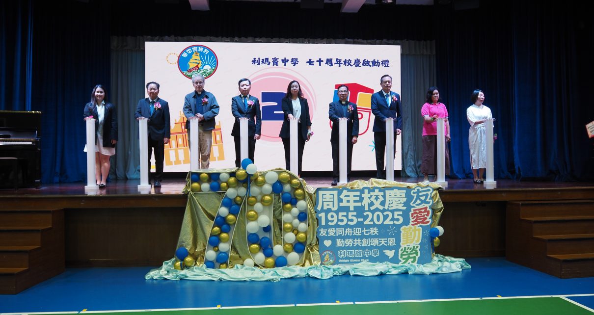 校史介紹過後,70周年校慶啟動儀式正式開始,主持儀式的嘉賓包括:教青局蔡敏芝代副局長、中聯辦教育及青年工作部徐之平副處長、天主教澳門教區鍾志堅副主教、耶穌會院長傅南渡院長、天主教學校聯會副監事長暨利瑪竇中學校董黃彪校長、中華教育會陳春新副理事長、利瑪竇中學張慧玲校長、校友會李倩儀會長、家教會方愛娟女士。