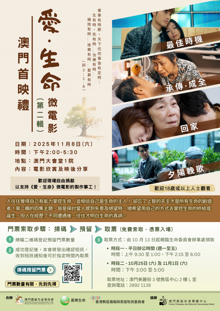由澳門教區生命委員會、香港教區婚姻與家庭牧民委員會及香港信徒團體「喜樂生命」合辦,澳門教區社會傳播中心協辦的《愛‧生命》微電影(第二輯),正是以生命的後段為主題,圍繞晚年、自殺及病弱等議題,帶出人在困境中,對生命價值的思考,與及如何在信仰中找到希望。