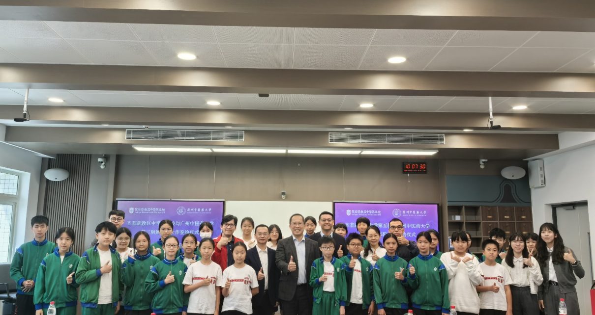 10 月 28 日,聖若瑟教區中學第五校黃建民校長、林鎮翔副校率「中醫藥研究及種植小組」赴廣州中醫藥大學簽署合作協議。大學將提供中醫藥課程教學與技術支持,助力學校「中醫藥進校園」計劃,普及相關知識、拓闊學生視野,同時強化兩校科研與學術交流聯繫。