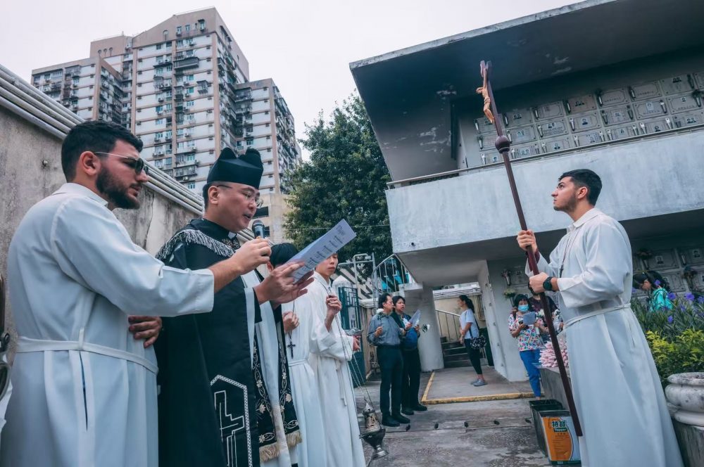 (本報訊)11月2日主日為追思節,各堂區均舉行多場彌撒聖祭,一同為已亡的兄弟姊妹祈禱。李斌生主教早上在聖彌額爾小堂特為已亡之紀律部隊奉獻追思彌撒,緬懷已故及殉職的警務人員。聖老楞佐堂主任司鐸劉偉傑神父在望廈新西洋墳場的慈悲聖母小堂舉行追思祈禱會,向墳墓灑聖水,並與在場教友一同為亡者祈禱。
