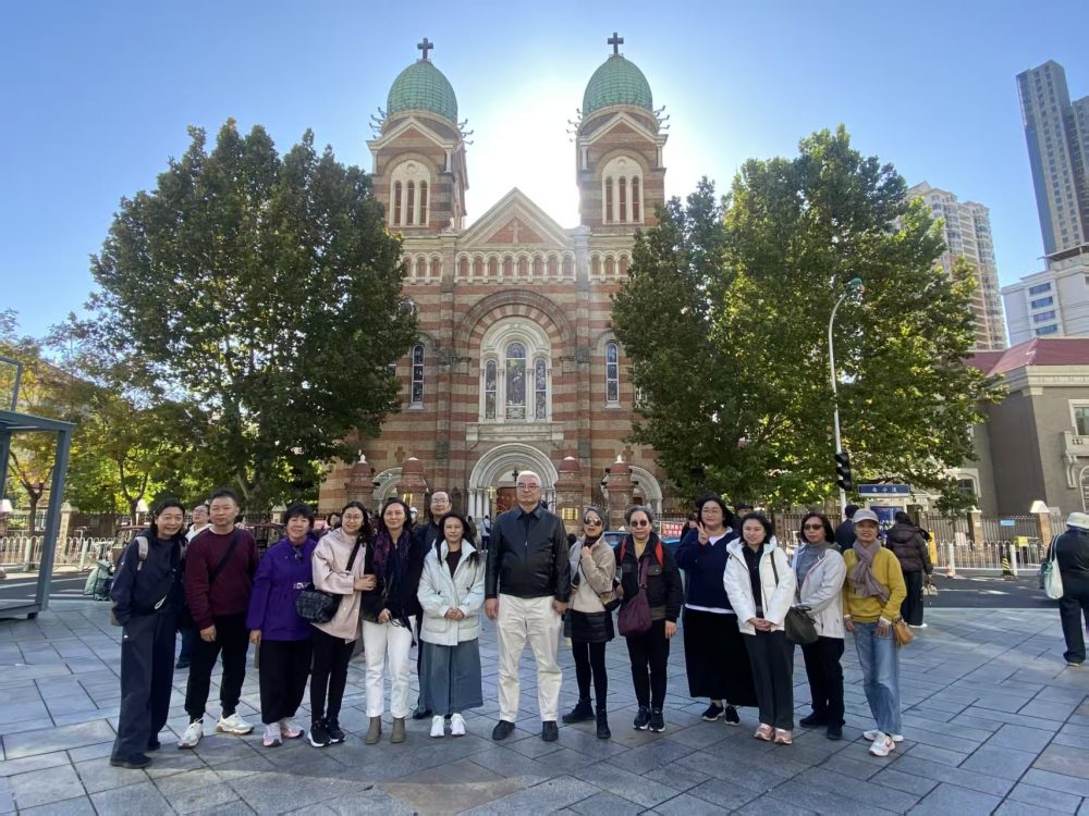 隨後,參訪團來到天津近代建築的經典代表——「西開教堂」。作為天津市最大的羅馬式建築,西開教堂以紅黃花磚築成的主體、三座綠色穹頂與彩色玻璃鑲嵌的窗戶,展現出濃厚的西式宗教建築風情,教職員們在參觀中了解到聖堂背後歷史背景的獨特意義。